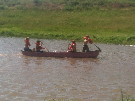Cody Law taught the scouts how to start a fire with a bow; many of the scouts tried this and were successful and earned a bead. They also earned beads for learning knot tying with David Leavitt. Mike Kazek did the cooking for the junior staff and taught some cooking skills. Mark Larson, a varsity scout serving on the junior staff, helped the younger scouts with their shelters for the wilderness survival merit badge. “I was really impressed with the shelters they built for sleeping in the forest,” Mark said. “The crawdad cook was awesome,” said Jaron Hafen, “there were lots of crawdads to catch at the reservoir and David Leavitt helped us cook them; they were awesome!” Friday the scouts went to Kolob Reservoir for water activities with canoe races, learning how to swamp the canoe and right it again. The scouts built a raft by tying logs together and attempted to row it to the other side of the lake.